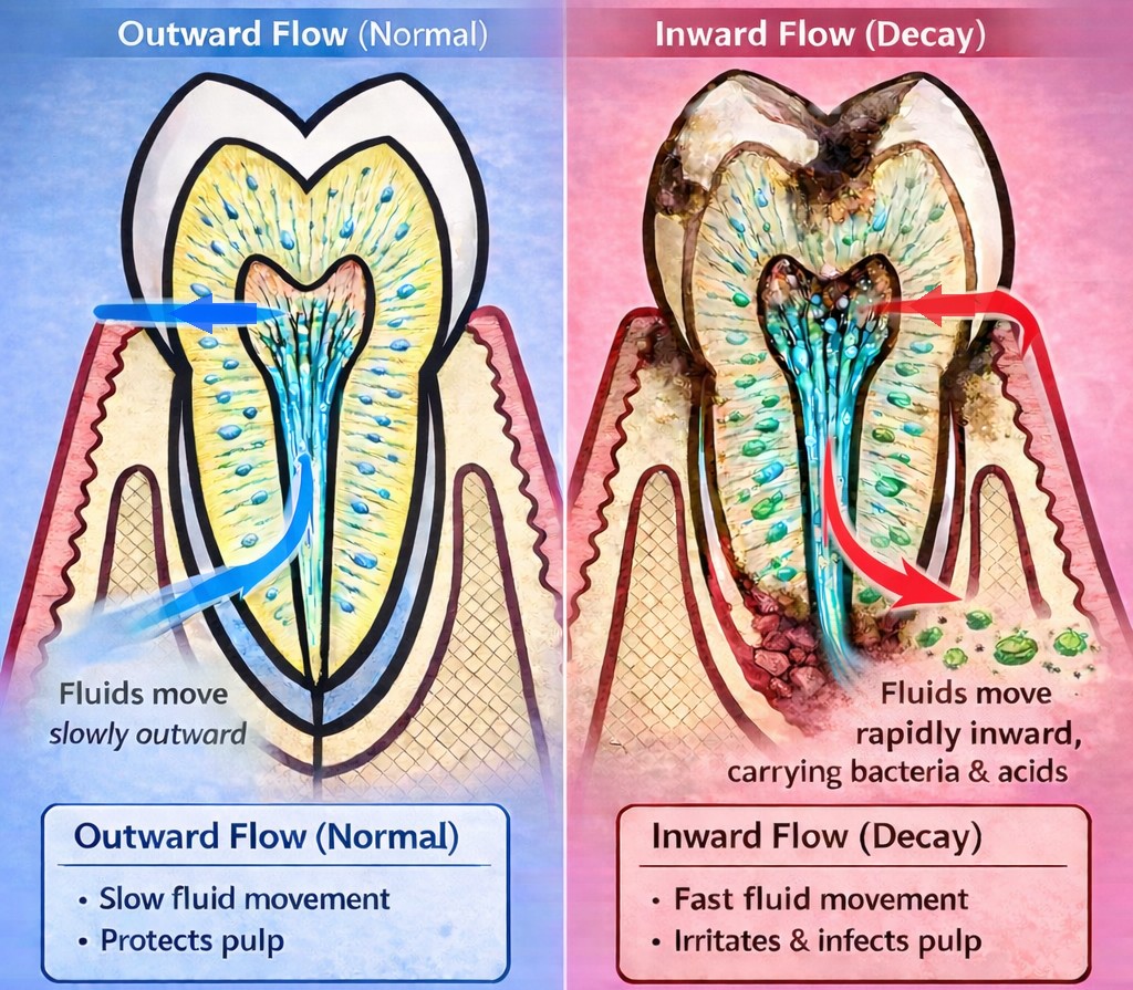 さらに進行う蝕では、表層が崩れて「栓(スミア層)」が失われやすく、圧や浸透圧の変化で内向きの「逆流」が起こると、酸や細菌由来物質が細管を通って歯髄側へ届き、歯髄炎の引き金になりえます。