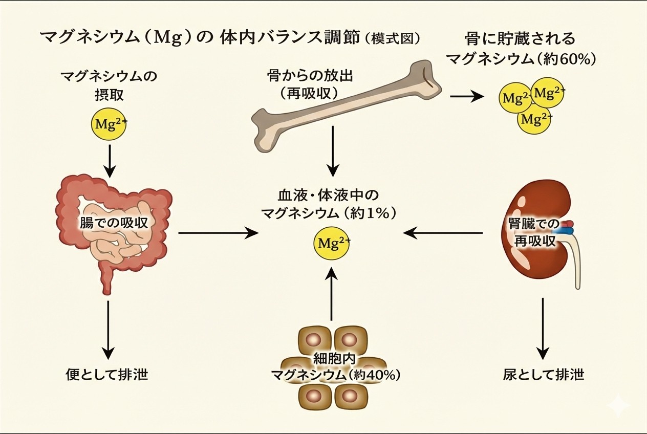 - マグネシウムは、腎臓でカルシウムを外に出す手助けをし、腎臓の石を防ぐ役目がある。