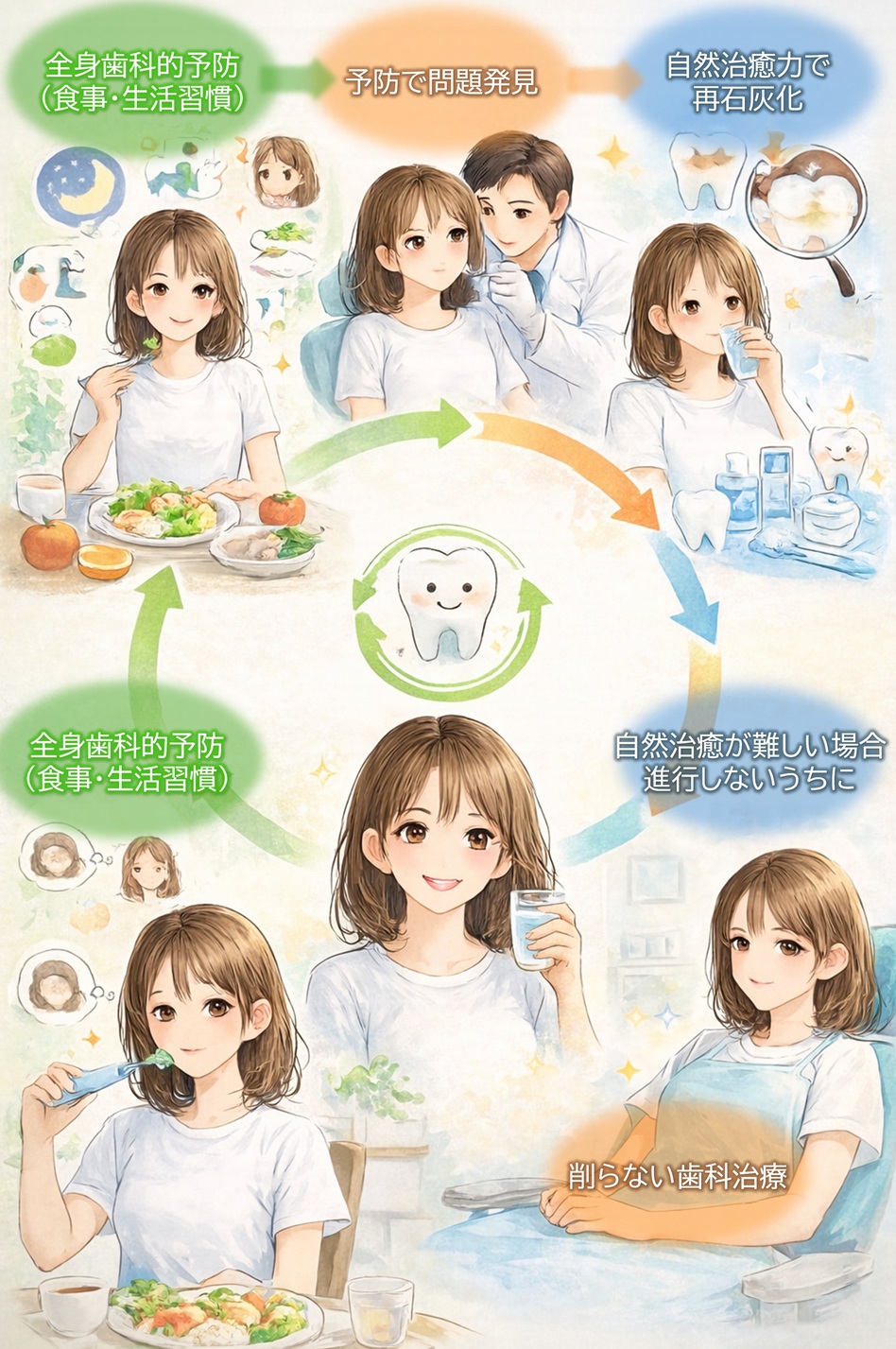 発見が遅れるほど、治療は「削る」「神経を取る」方向に近づき、歯は構造的に弱くなり、再治療の連鎖に入りやすくなります。定期検診は、クリーニングのみでなく、「削らないため検査」と「食事の改善」です。早期発見こそが、削らずに歯を守るための最短ルートであり、当院が定期管理を重視する理由です。