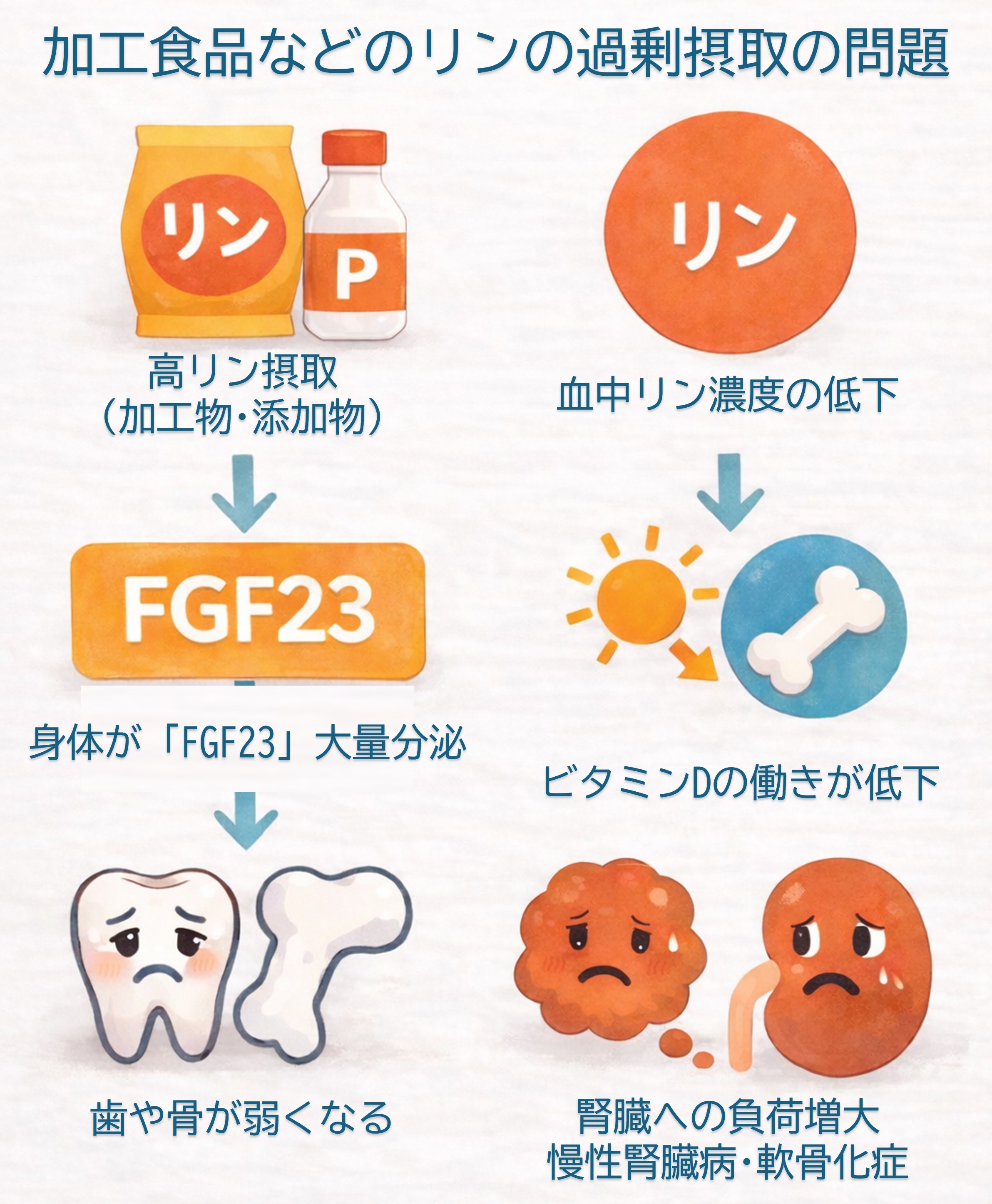 腎臓での活性型ビタミンDの産生を抑え、結果として腸からのリンやカルシウム吸収を抑える方向に働きます。 - 加工食品のリン
