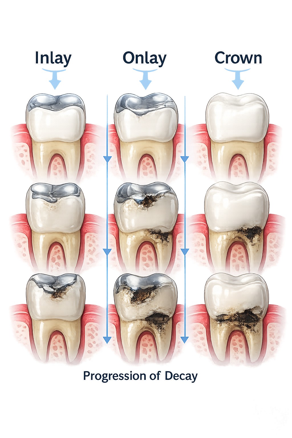 - 詰め物・被せ物が大きくなる(インレー →アンレー →クラウン)
