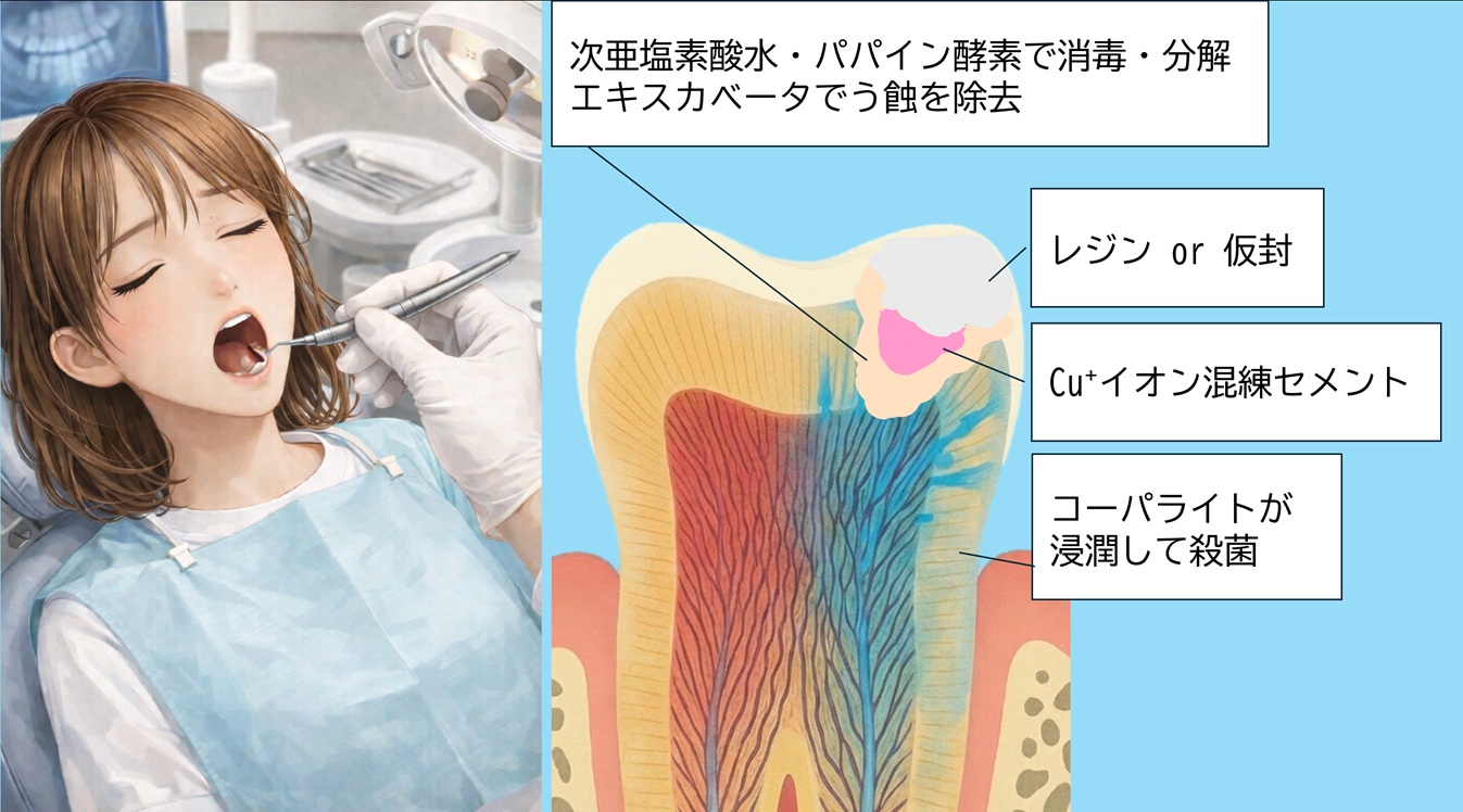 Cu⁺(銅イオン)セメント療法は、抗生物質を用いず、銅イオン(Cu⁺/Cu²⁺)の多点抗菌作用を利用して、う蝕病巣・感染象牙質・バイオフィルムを制御しつつ封鎖する治療アプローチ。